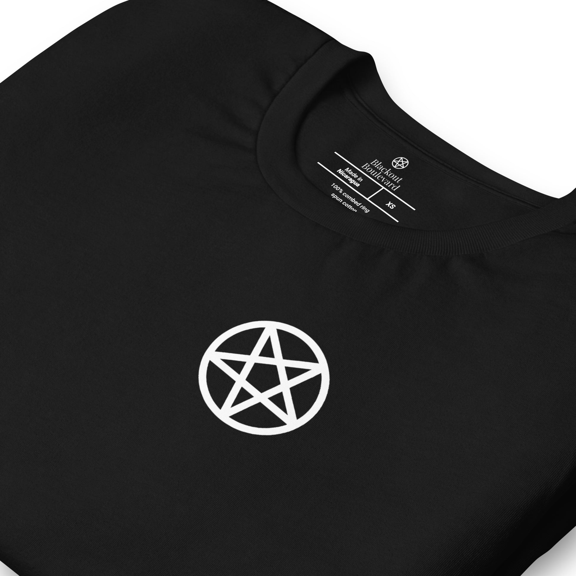 A signal in shadow. The Beacon T-Shirt carries the pentagram insignia—stark, restrained, and enduring.