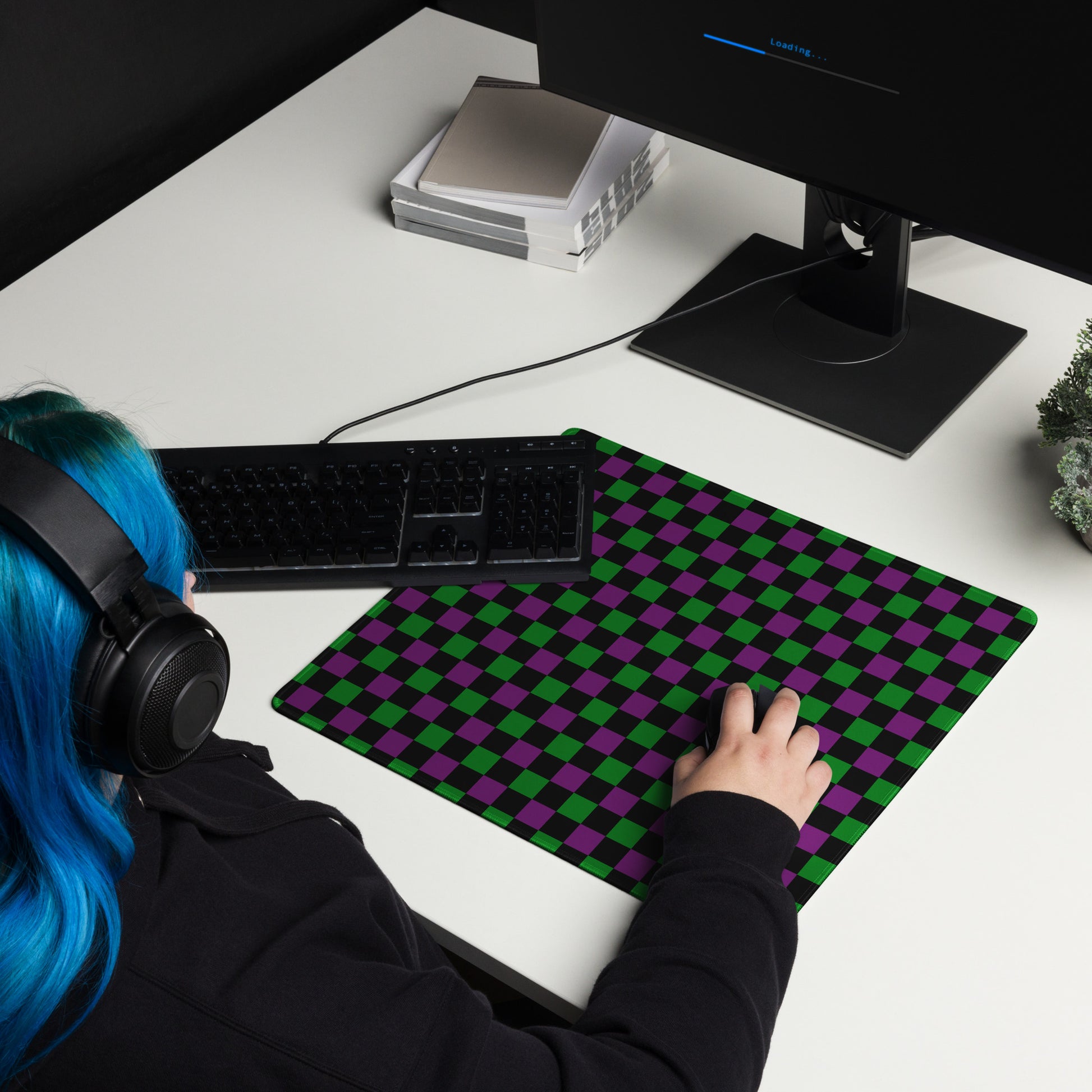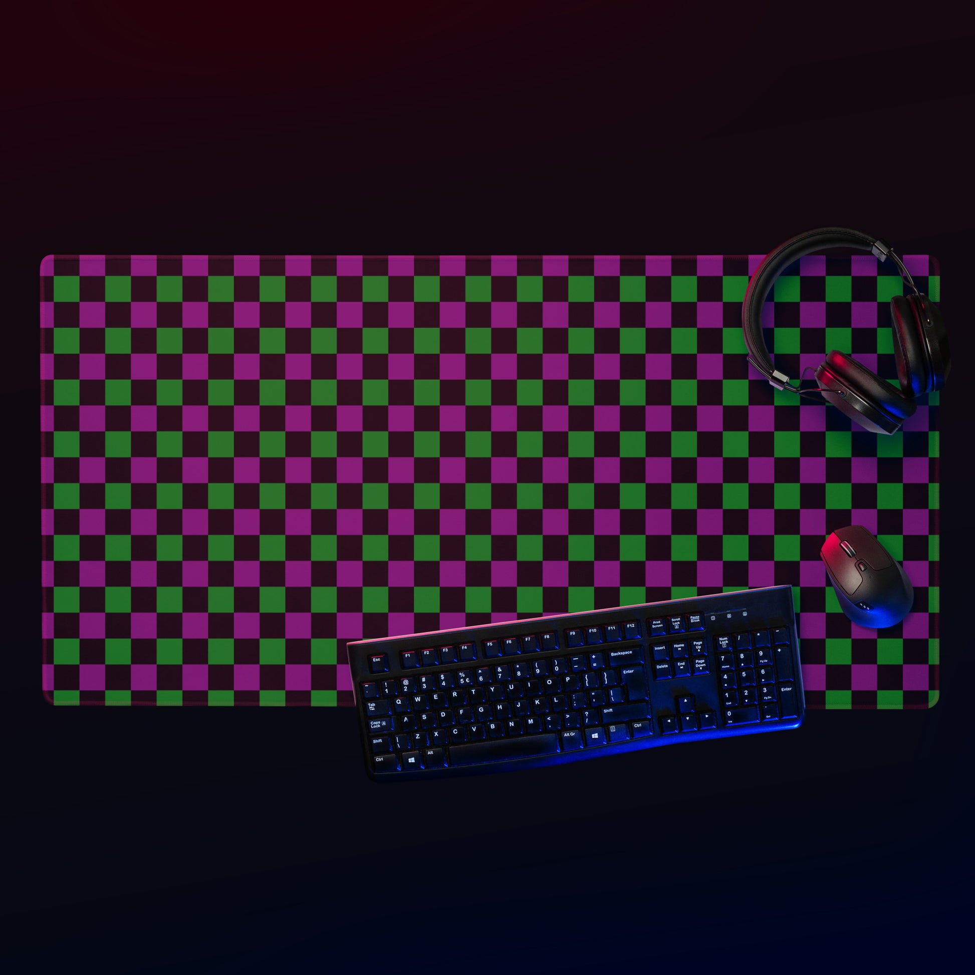 The purple green checkerboard mouse mat keeps your desk sharp, strange, and unforgettable.