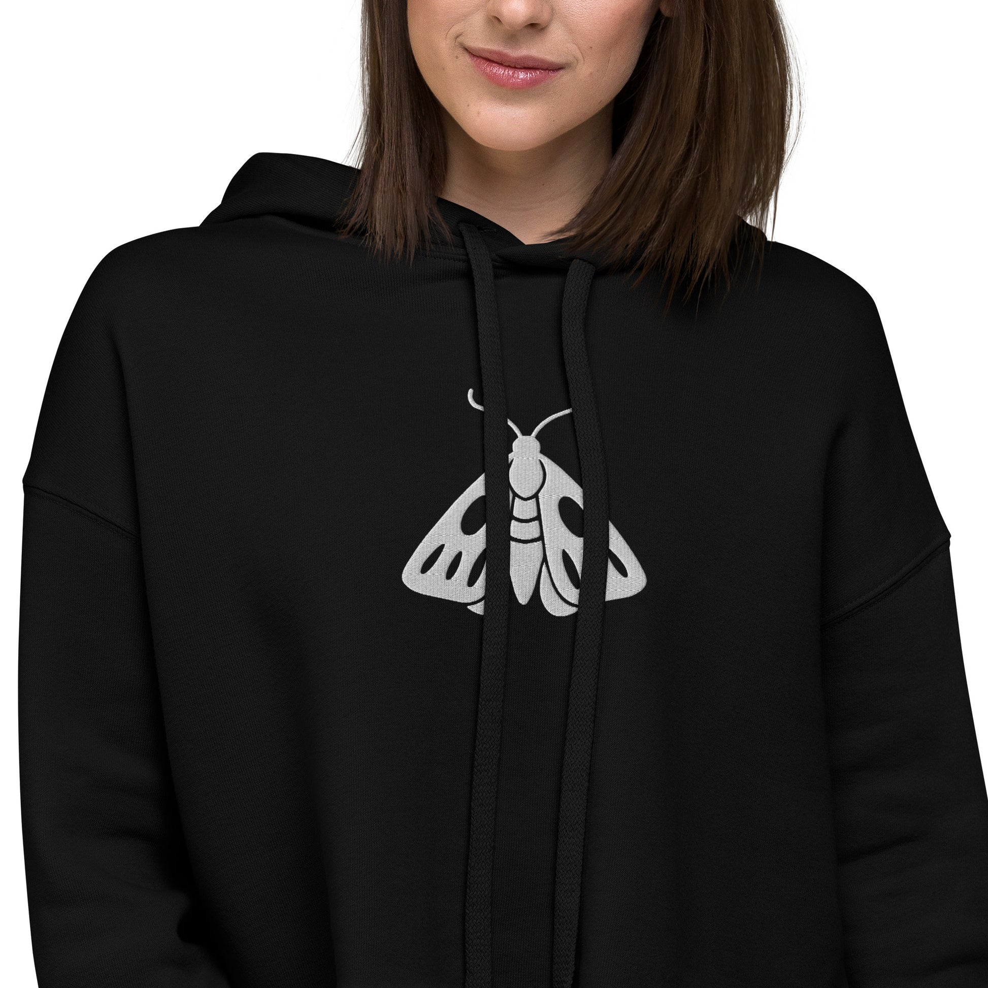 The Moth Crop Hoodie carries nocturnal beauty in a cropped silhouette — soft, dark, and made for nights that stretch past midnight.