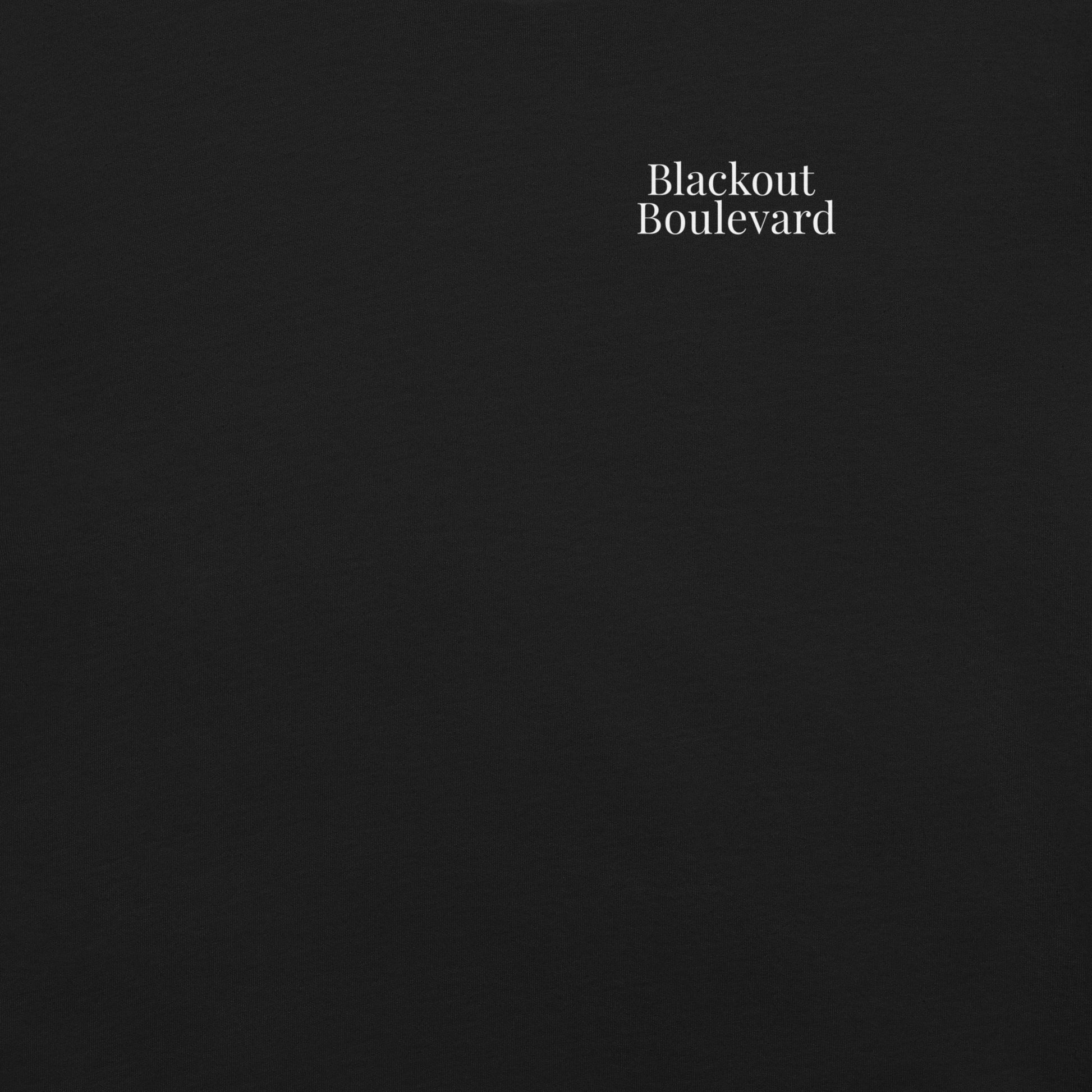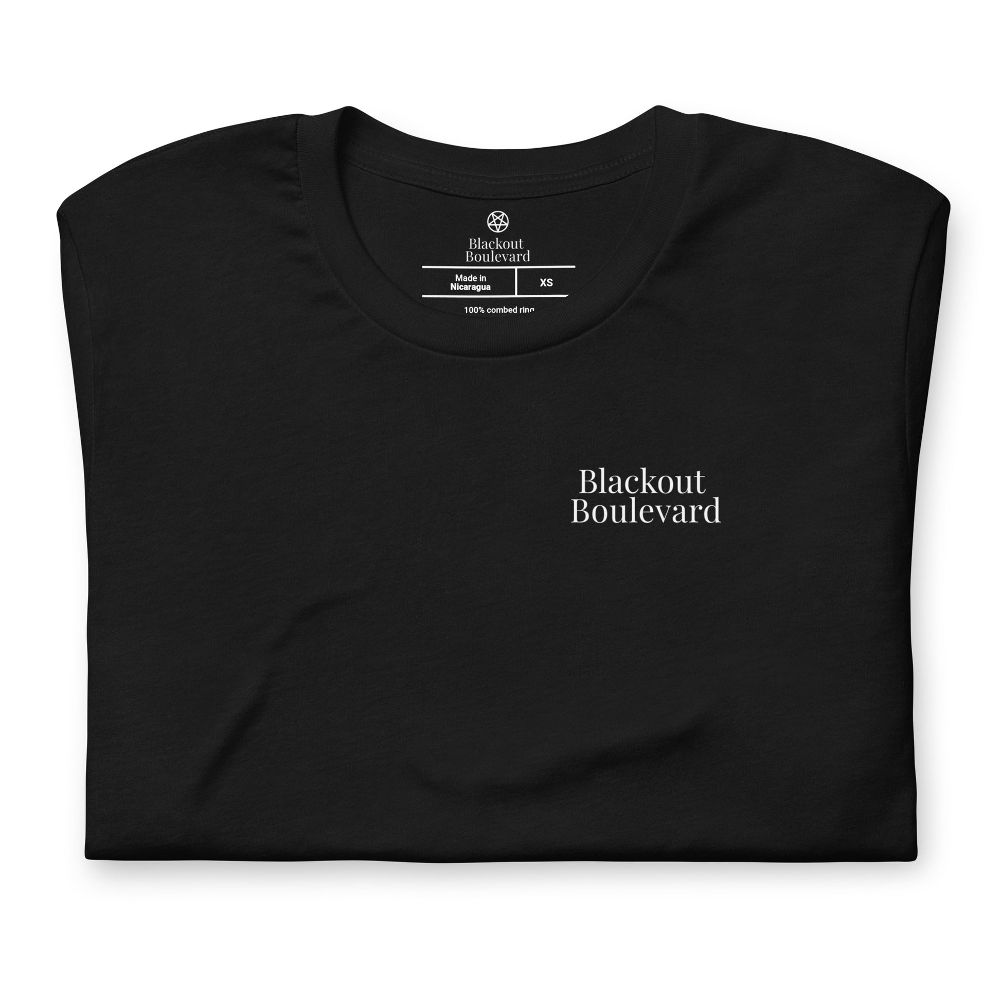 Words in shadow. The Script T-Shirt carries Blackout Boulevard in stark lettering; subtle, minimal, and unrelenting.